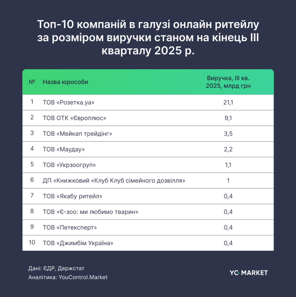 - ТОВ ОТК “Європлюс” – оператор роздрібної мережі магазинів Rozetka (офлайн-точки видачі та супутні магазини). Фактично є частиною бізнес-екосистеми Rozetka, відповідальною за обслуговування клієнтів у фізичних торгових точках. Виторг цього підприємства станом на кінець вересня 2025 року склав 9,1 млрд грн. Сукупно дві перші компанії формують левову частку онлайн-продажів країни.