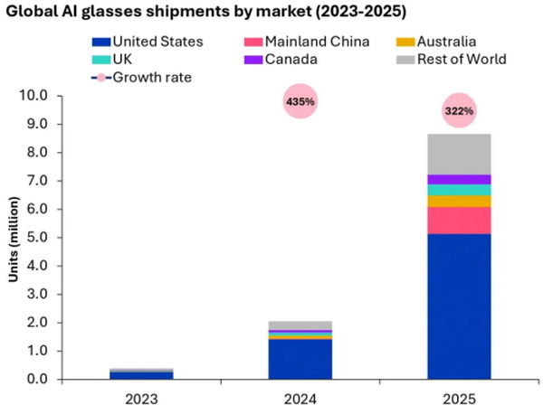 Проте сегмент моделей із дисплеями також зростає: у 2025 році їх відвантажено 730 тис. одиниць (8,4% від загального обсягу) проти 3,3% роком раніше. Китайські виробники забезпечили 71% цих поставок, серед них — Rokid, Alibaba та Even Realities.